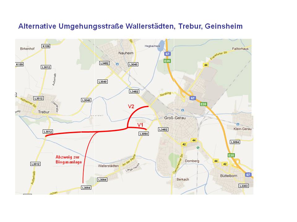 Wir unterstützen die Forderung der Gemeinde Trebur nach einer Ortsumgehungsstraße in Trebur und verbinden dies mit der Forderung eines Durchfahrtverbots für LKW in Wallerstädten! Wir schlagen aber eine andere Straßenführung als die bisher geplanten varianten vor!